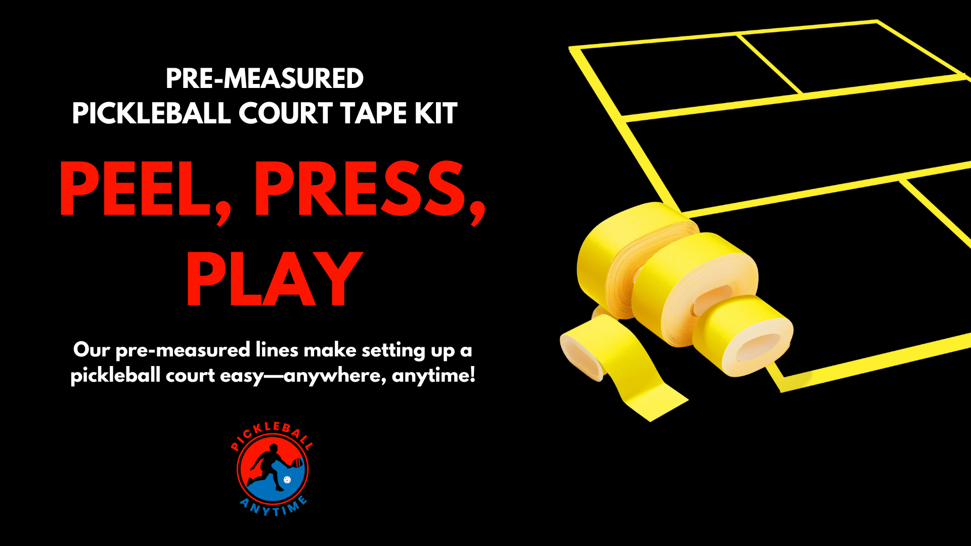Set up your regulation-sized Pickleball court effortlessly and in minutes with our pre-measured Pickleball Anytime Complete Court Tape Kit.